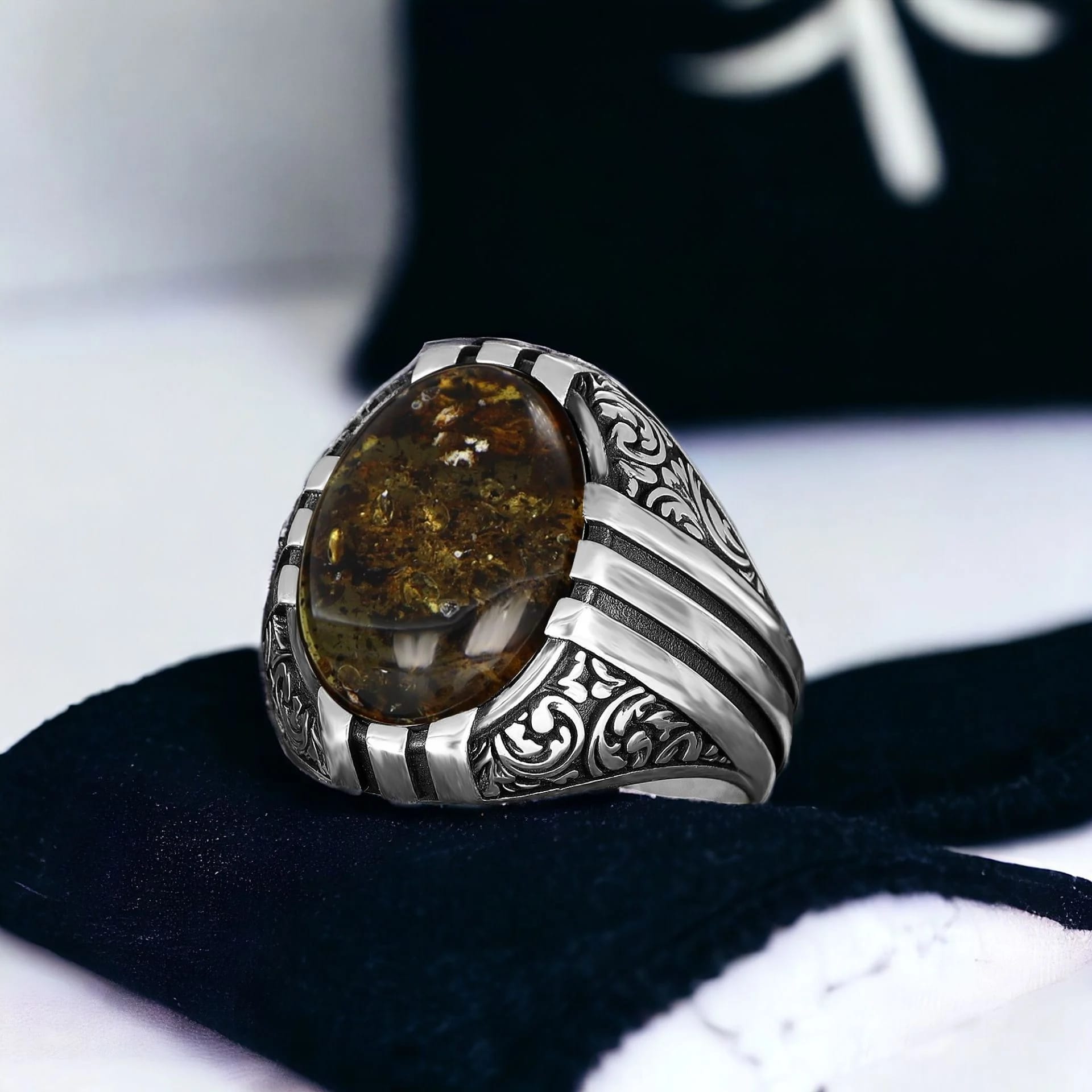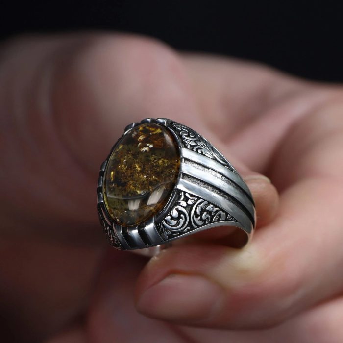 ÜRÜN HAKKINDA: Fosilli Damla Kehribar Taşlı Erkek Gümüş Yüzük