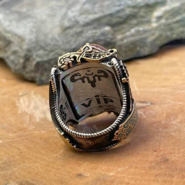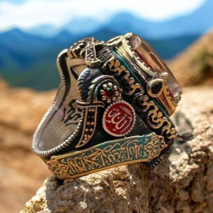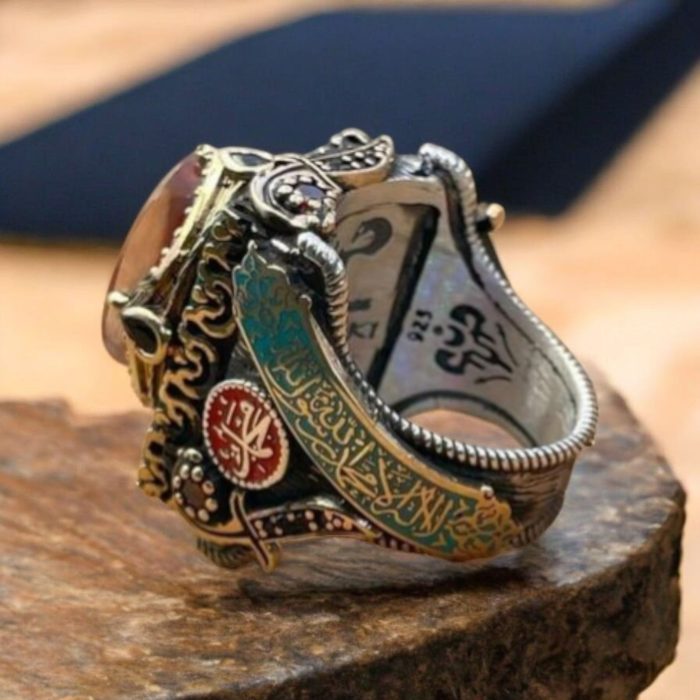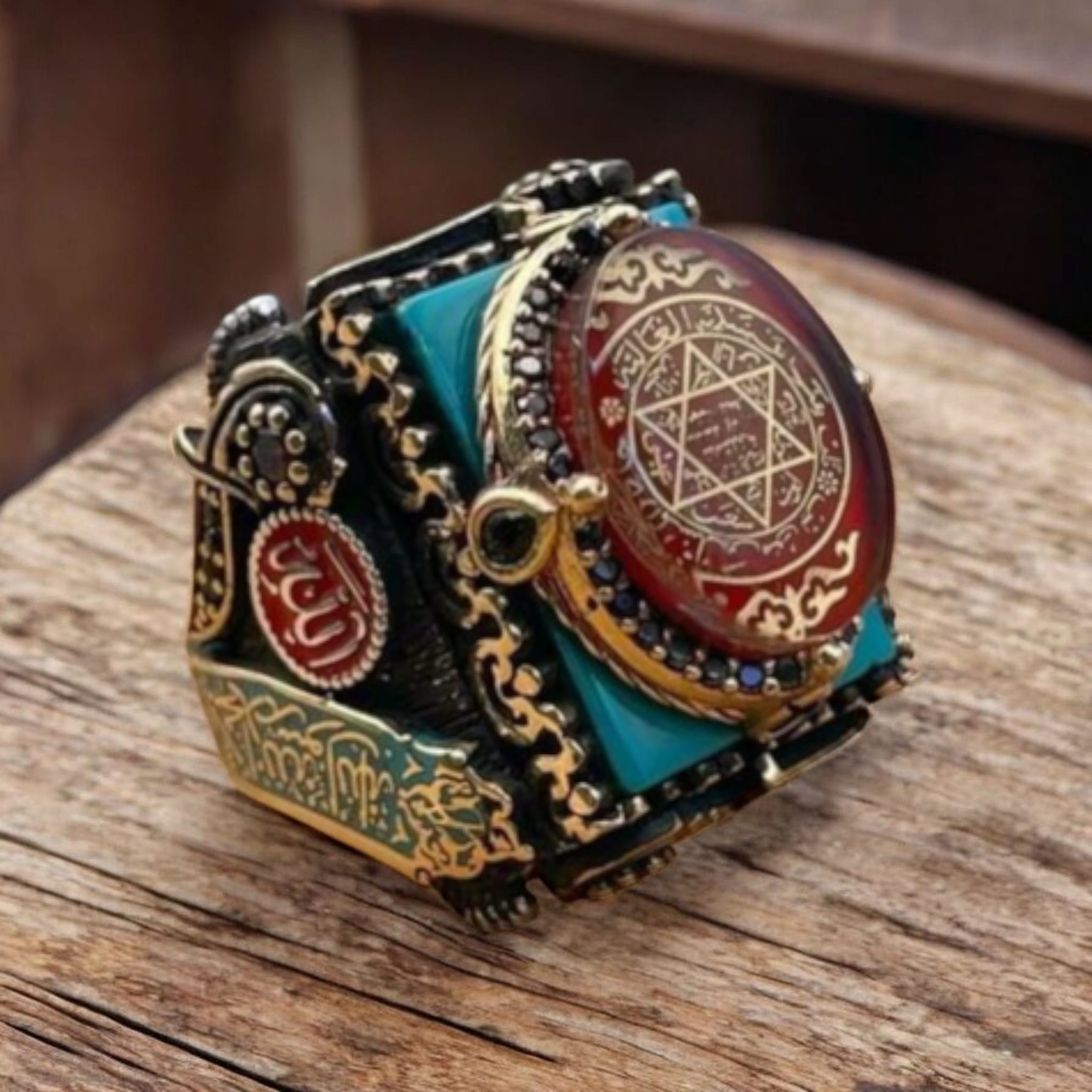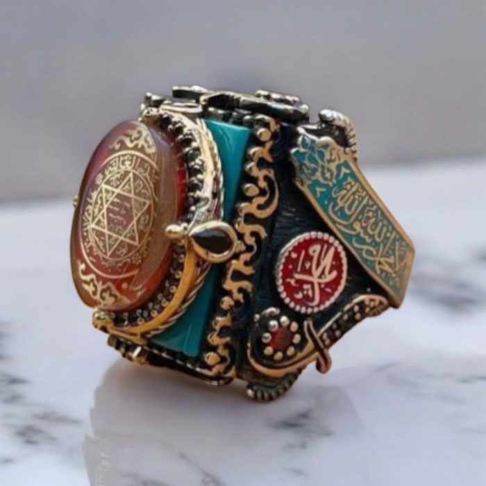Hem estetik hem de anlam bakımından zengin bir tasarımdır. Ön kısmında turkuaz taş üzerine kırmızı mineli Mührü Süleyman işlemesi Yanlarda Kelime-i Tevhid ve Hz. Muhammed (s.a.v.) Peygamber lafzı ile şıklığı ön plana çıkarır. Geleneksel kılıç detayı ile manevi değeri yüksek detaylar işlemesi ile tamamlanarak tarihe dokunuş sunar. El işçiliğiyle özenle üretilen bu yüzük, özel kutusunda sunularak şık bir hediye seçeneği de oluşturur.